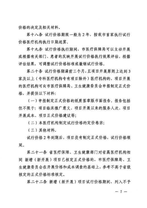 5.试行期满价格如何执行:试行期满前三个月,项目开展原则上达到3家及以上(专科医疗机构专有项目除外)医疗机构的,项目开展的医疗机构可向市医疗保障局、卫生健康委申报制定正式价格。试行价格2年到期后,项目没有制定正式价格,试行价格顺延。