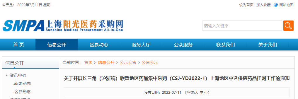 自2022年7月12日起,企业可登录“上海市医药采购服务与监管信息系统”进入“药品申报”子栏目,在挂网类型中选择“长三角(沪浙皖)药品集采上海地区中选供应品种”上报上海地区中选供应药品相关信息,申报截止时间为7月21日。